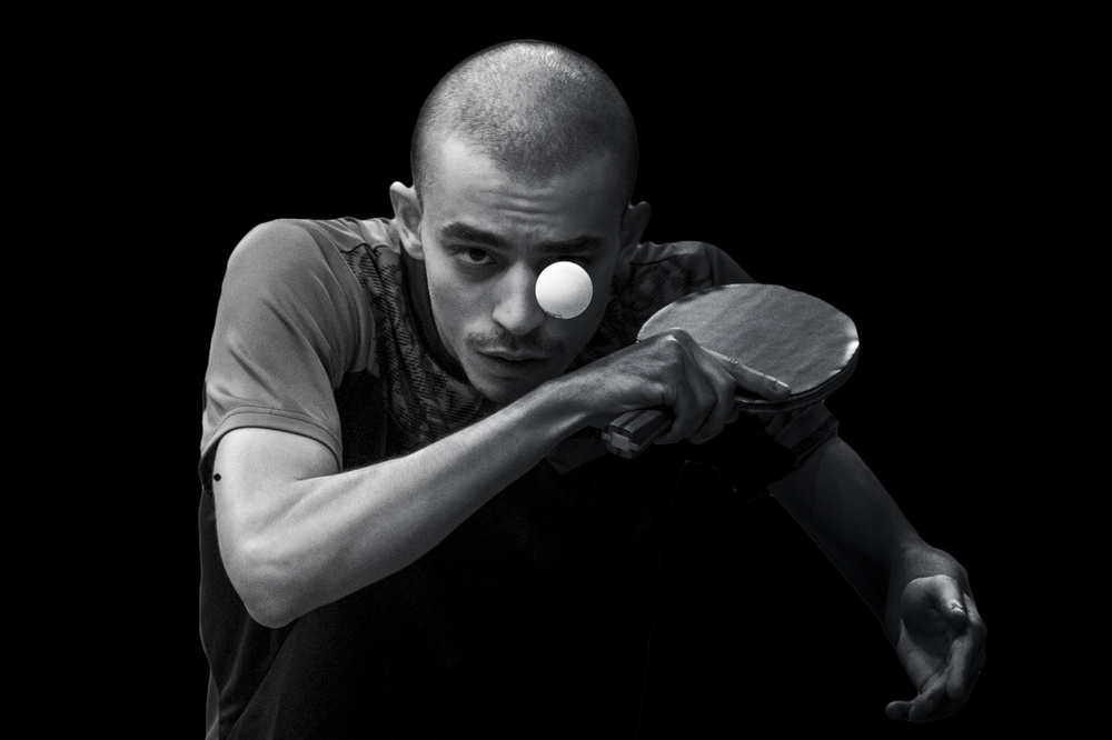It is a spit second moment, catching the ping-pong player in the middle of his service, just before hitting the ball that covers his right eye. The effect would have been spoiled if the ball were a bit higher or lower, or if the bat would have been in other position. It takes a keen photographer's eye, knowledge of the game or a lot of exposures to get a result like this.